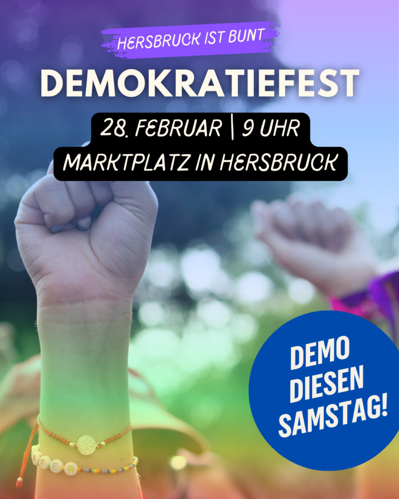 Wir haben leider erfahren, dass die Nazis von der AfD am kommenden Samstag, 28. Februar, erneut in Hersbruck auftreten wollen. Diesmal wissen wir aber so rechtzeitig Bescheid, dass wir etwas entspannter Gegenprotest organisieren können. Es ist Kommunalwahlkampf, deshalb sind wir nicht alleine da: Auch die Ortsverbände von Bündnis 90/Die Grünen, der SPD und von Die Linke sind mit Informationsständen am Oberen Markt vertreten und stellen ihre Infostände gemeinsam mit unserer Kundgebung unter das Motto Demokratiefest gegen die AfD. Mit den Veranstaltungen der Parteien und unserer Gegenkundgebung gibt es diesmal nicht nur lautstarken Gegenprotest, ihr könnt euch an den Ständen der Parteien auch mit den übrigen Parteien austauschen und diskutieren und euch mit Punsch und kleinen Snacks stärken – das ist gelebte Demokratie! Rechtsextreme wollen wir hier in Hersbruck nicht – über alles andere können wir reden.